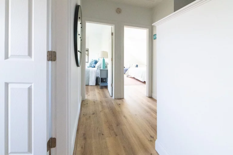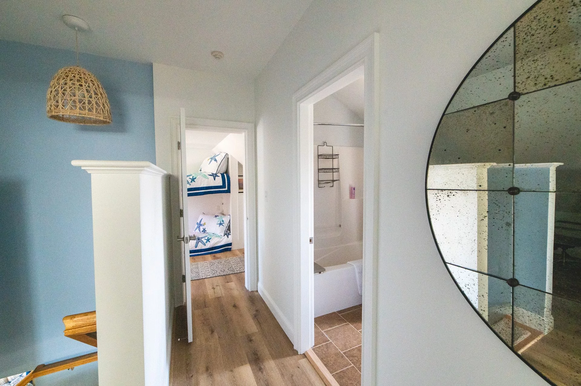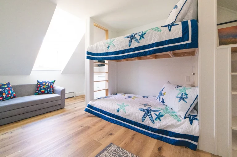 The original upstairs space was a giant room with awkward nooks, a laundry room, and a bathroom. We divided the main room into two bedrooms and transformed the laundry room into a children’s bedroom, complete with custom built-in bunk beds. The laundry machines were relocated to a more accessible downstairs location.
