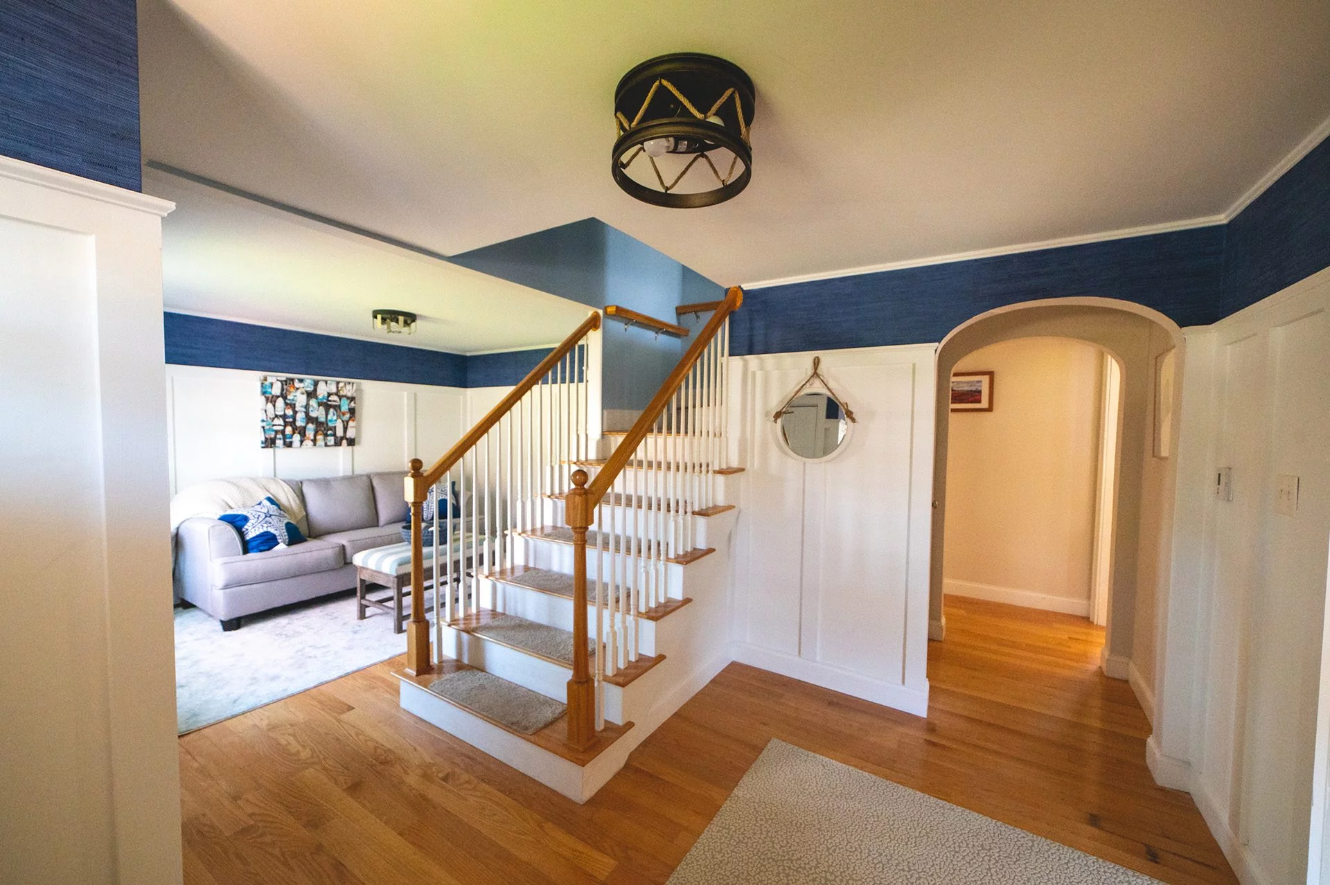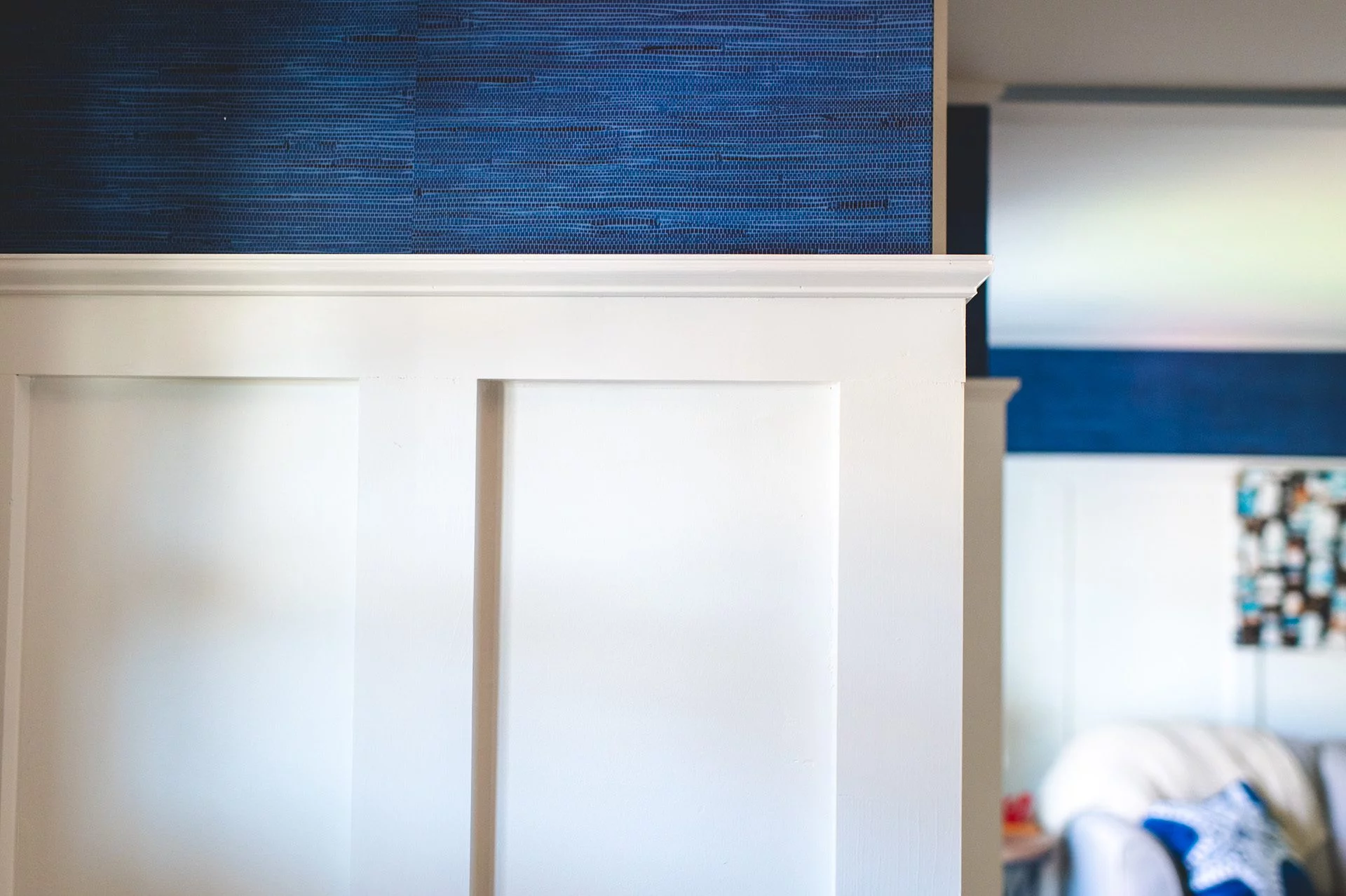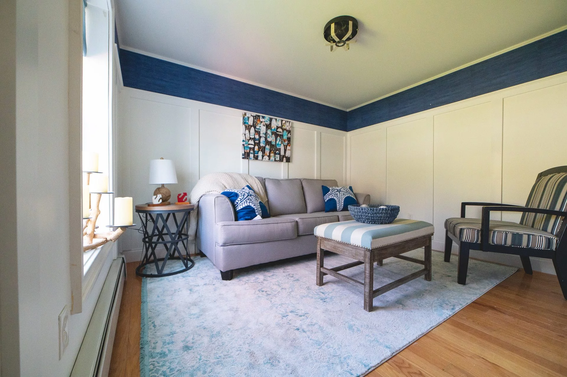 Downstairs, we updated the front entry by adding a closet, perfect for keeping beach toys out of the way. The front living room was transformed with the installation of custom wainscoting. We finished out the project by painting everything. Throughout the entire interior, there were inconsistencies in the paint: gaps between the wall and ceiling, brush strokes on certain walls, and visibly uneven paint on much of the trim. When we began the process of repainting, we took care to prevent similar issues, and the final result exemplifies our goals: The walls are immaculately painted and brighten each of the rooms. There are also selected accent walls to complement the primarily white ambiance.