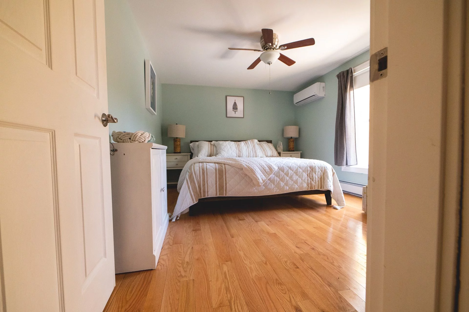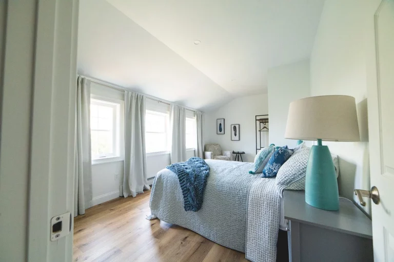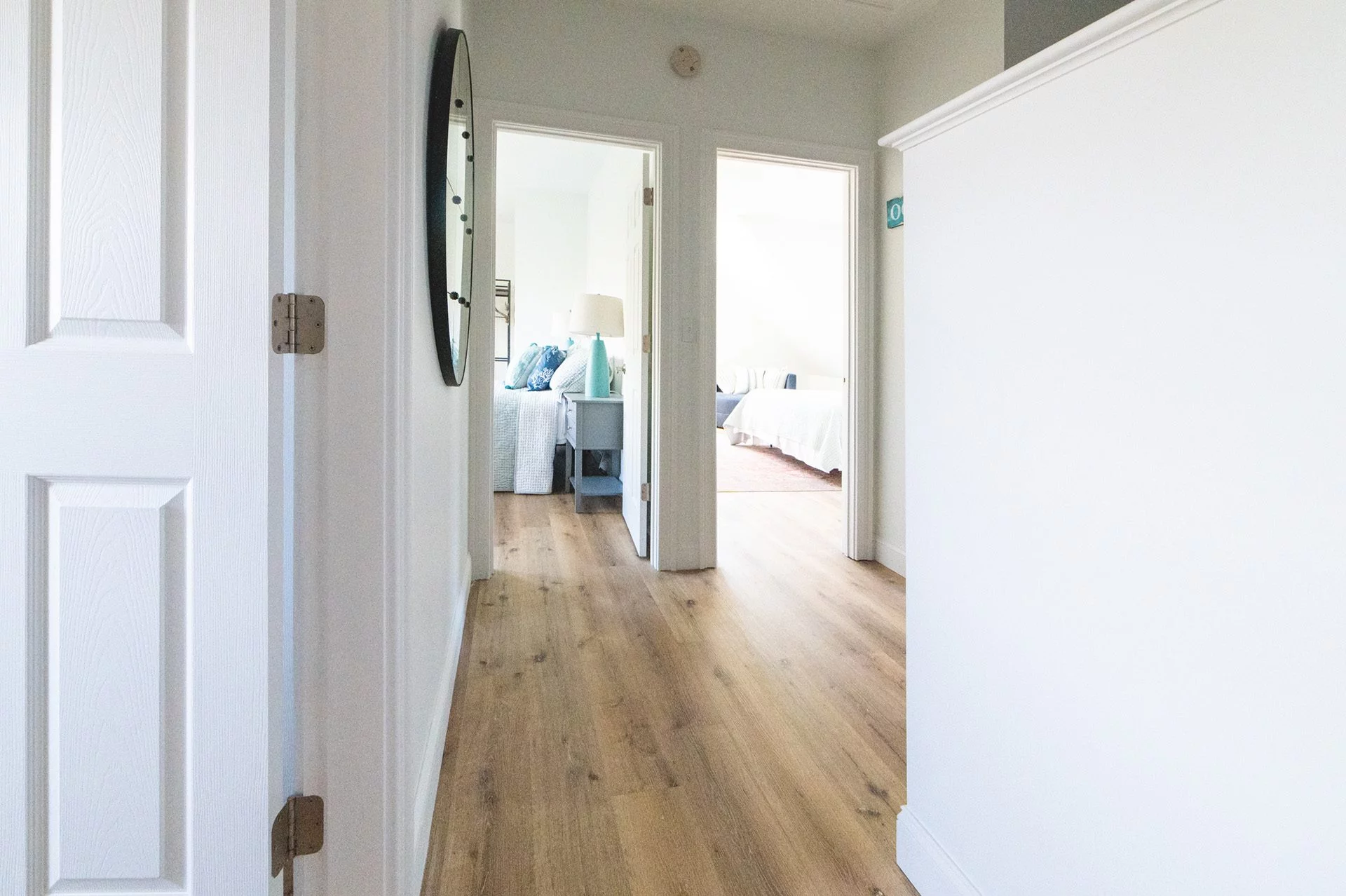 Downstairs, we updated the front entry by adding a closet, perfect for keeping beach toys out of the way. The front living room was transformed with the installation of custom wainscoting. We finished out the project by painting everything. Throughout the entire interior, there were inconsistencies in the paint: gaps between the wall and ceiling, brush strokes on certain walls, and visibly uneven paint on much of the trim. When we began the process of repainting, we took care to prevent similar issues, and the final result exemplifies our goals: The walls are immaculately painted and brighten each of the rooms. There are also selected accent walls to complement the primarily white ambiance.